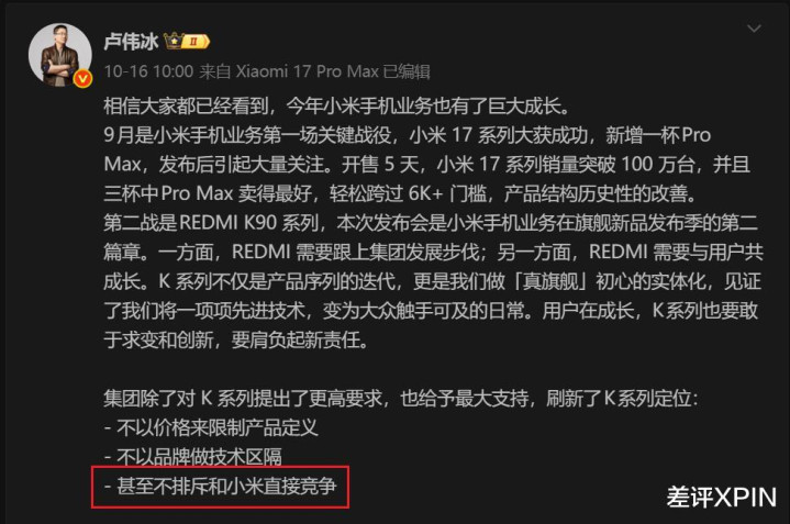在看到卢总发消息说,今年 REDMI K90 系列不排斥和小米直接竞争的时候,托尼还不是很在意。