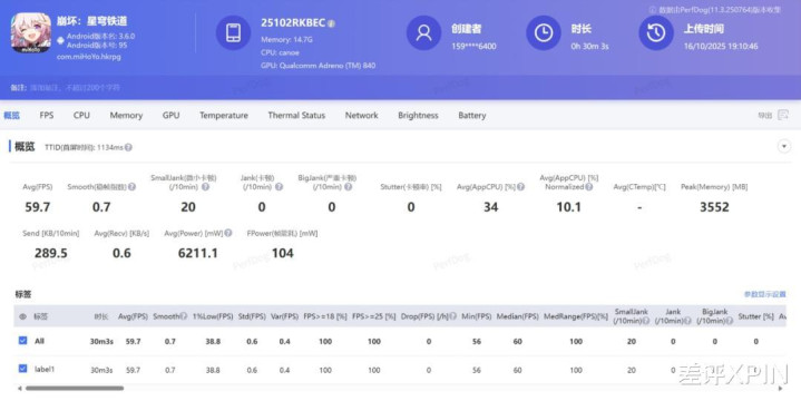 而压力更大的崩坏:星穹铁道-黄金的时刻跑图,则是以 6.2w 的功耗跑出了 59.7帧。
